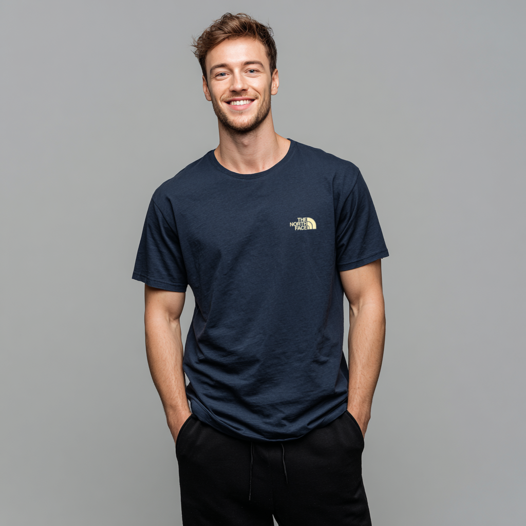 Bawełniana, koszulka męska. Solidne wykonanie, komfort noszenia, granatowy kolor, na przodzie wyraźne logo The North Face. Bestseller wśród modeli marki, najchętniej wybierana na prezent.